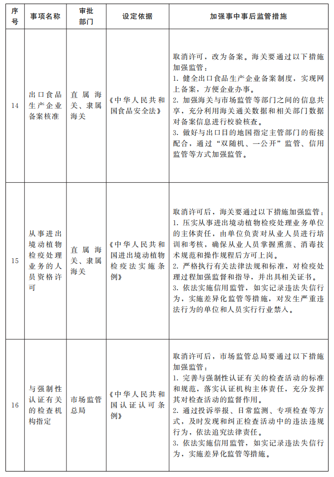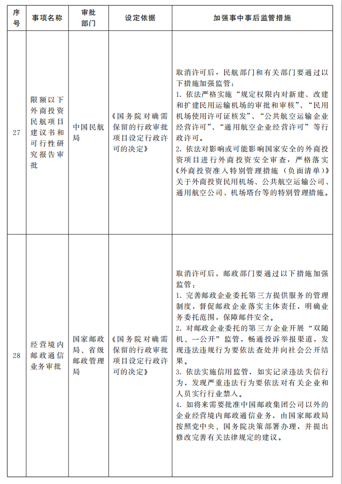 经研究论证,国务院决定取消29项行政许可事项,下放4项行政许可事项的审批层级,现予公布。另有20项有关法律设定的行政许可事项,国务院将依照法定程序提请全国人民代表大会常务委员会修订相关法律规定。