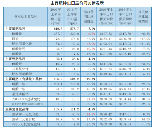 据中国海关统计,2020年1―6月中国共出口各种肥料1193.5万吨(含HS第28章氯化铵、硝酸钾和HS第31章所有肥料),同比减少了5.3%。硫酸铵是累计出口量最多的肥料品种,1-6月累计出口硫酸铵357.91万吨。