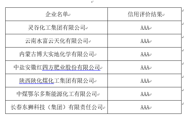 附件:中国氮肥、甲醇行业企业信用等级评价(第四批)结果