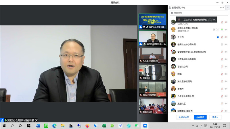 2022年5月13日,由中国氮肥工业协会主办的“2022年春季氮肥市场形势分析会(线上会议)”成功召开。中国氮肥工业协会理事长顾宗勤出席会议并做主旨讲话。来自氮肥生产加工、贸易流通和新闻媒体等单位近200人参会,有关骨干企业设分会场组织人员集体收看。