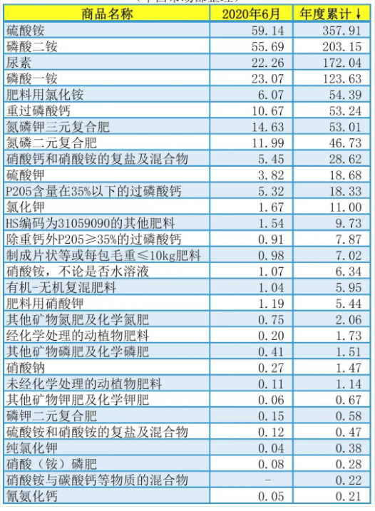 2020年6月当月,中国出口量排在前5名的肥料品种:①硫酸铵59.14万吨,②磷酸二铵55.69万吨,③磷酸一铵23.07万吨,④尿素22.26万吨,⑤氮磷钾三元复合肥14.63万吨。
