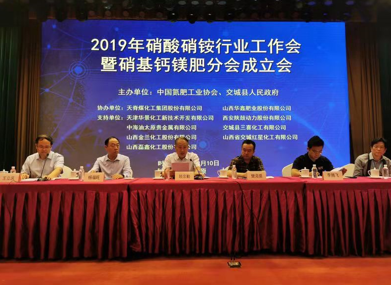 2019年9月10日,由中国氮肥工业协会、交城县人民政府联合主办的2019年硝酸硝铵行业工作会暨硝基钙镁肥分会成立会在山西太原隆重召开。中国氮肥工业协会理事长顾宗勤、陕西兴化集团有限责任公司董事长樊迟摇⑻旒姑夯 工集团股份有限公司副总经理杨福旺、山西华鑫肥业股份有限公司总经理李腾飞、天津华景化工新技术开发有限公司董事长景双伍等领导出席本次会议。中国氮肥工业协会秘书长王立庆主持会议。来自我国硝酸、硝铵、硝基肥等行业以及相关技术、设备企业230余代表参加了会议。