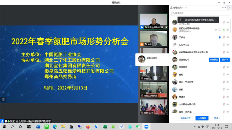 2022年5月13日,由中国氮肥工业协会主办的“2022年春季氮肥市场形势分析会(线上会议)”成功召开。中国氮肥工业协会理事长顾宗勤出席会议并做主旨讲话。来自氮肥生产加工、贸易流通和新闻媒体等单位近200人参会,有关骨干企业设分会场组织人员集体收看。