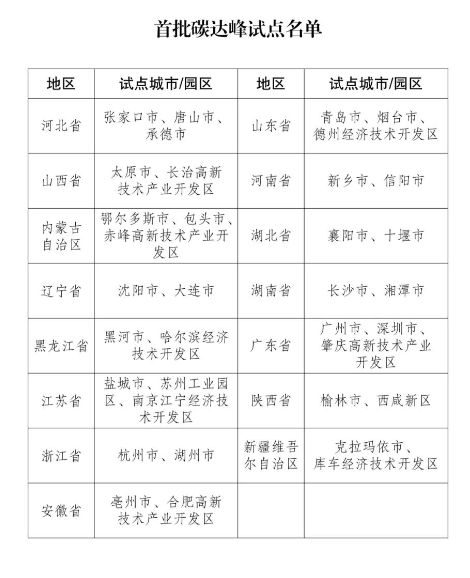 为落实国务院《2030年前碳达峰行动方案》(国发〔2021〕23号)有关部署,按照《国家碳达峰试点建设方案》(发改环资〔2023〕1409号)工作安排,经有关地区城市和园区自愿申报、省级发展改革委推荐、省级人民政府审核、国家发展改革委复核,确定张家口市等25个城市、长治高新技术产业开发区等10个园区为首批碳达峰试点城市和园区,现予公布,并就有关事项通知如下: