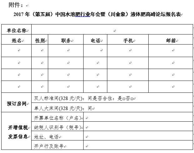 附件:2017年(第五届)中国水溶肥行业年会暨(川金象)液体肥高峰论坛报名表