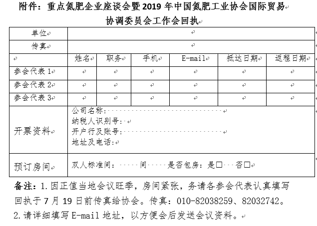 今年以来,国际形势错综复杂,国内安全环保监管加强,农业用肥需求疲软,国际市场不温不火,下半年国内将进入用肥淡季,国际化肥市场形势、化肥淡季储备制度改革、实体企业减税降费、天然气定价与销售体系改革、尿素期货上市等诸多因素将影响到氮肥行业经济运行。为分析下半年国内外氮肥市场及行业经济运行形势,研究应对措施,中国氮肥工业协会决定于2019年8月7-9日在内蒙古乌兰浩特市召开“重点氮肥企业座谈会暨2019年中国氮肥工业协会国际贸易协调委员会工作会”。现将会议有关事项通知如下: