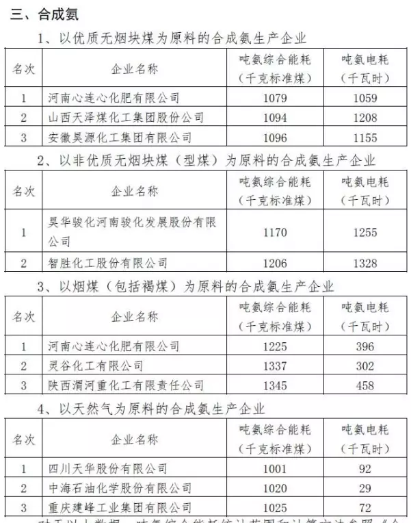 重点耗能产品能效“领跑者”标杆企业名单和指标(合成氨、甲醇)