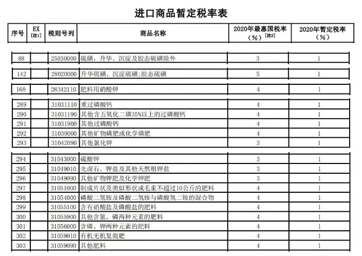 在进口关税方面,硫酸钾、磷肥、含氮磷两种肥效的化肥肥料、其他肥料等,2020年暂定关税均为1%。