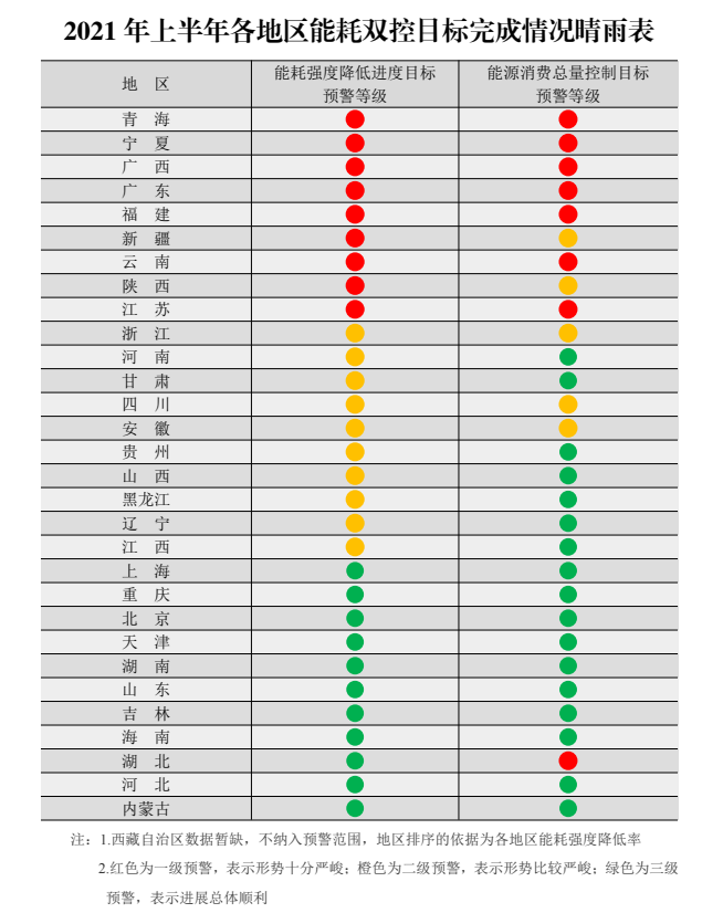 为贯彻落实党中央、国务院关于强化能耗双控的决策部署,加强能耗双控形势分析预警,根据上半年各地能源消费情况,我们制定了《2021年上半年各地区能耗双控目标完成情况晴雨表》,现印发给你们。
